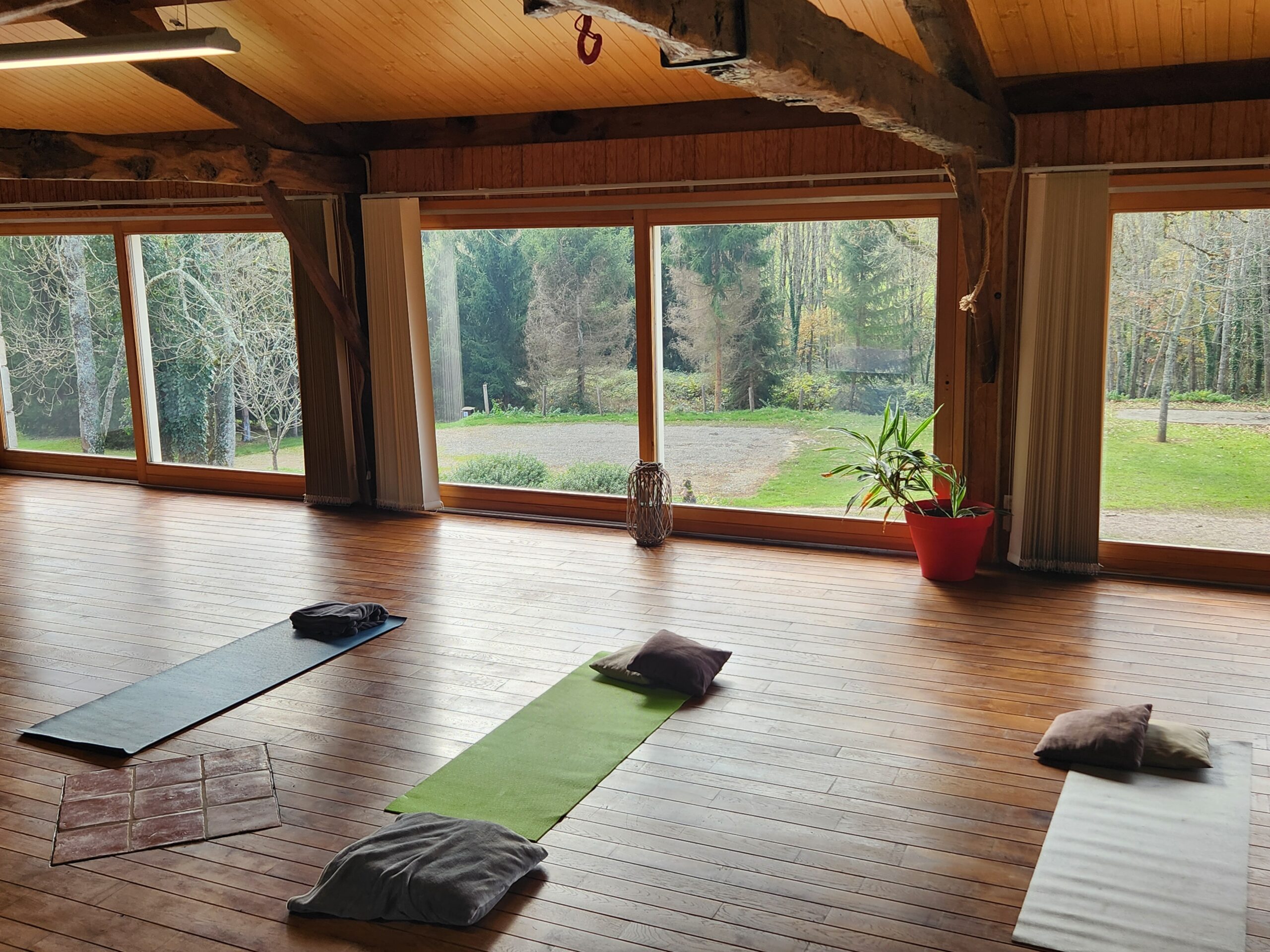 Grande salle de 110m2 avec plancher bois et poutres apparentes au 1° étage au-dessus de la piscine intérieure au sel chauffée à 28°. Vue sur le parc arborée à quelques pas du lac privé. Pour plus de chaleur, un poêle à granulés rechauffera l’ambiance